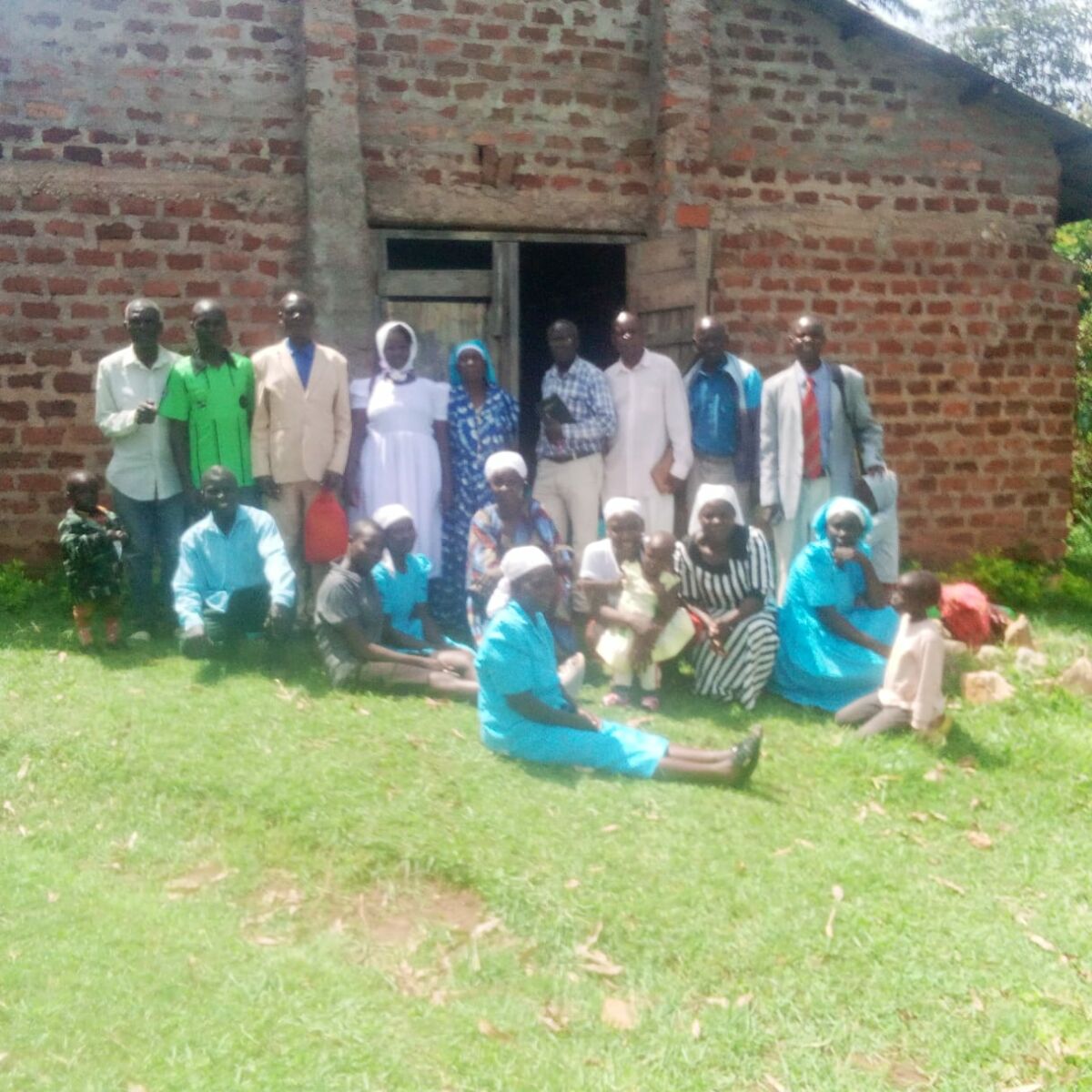 - Pastor Gilbert with a few of his church members in front of their church—the broken wooden door in the background needs replacing.