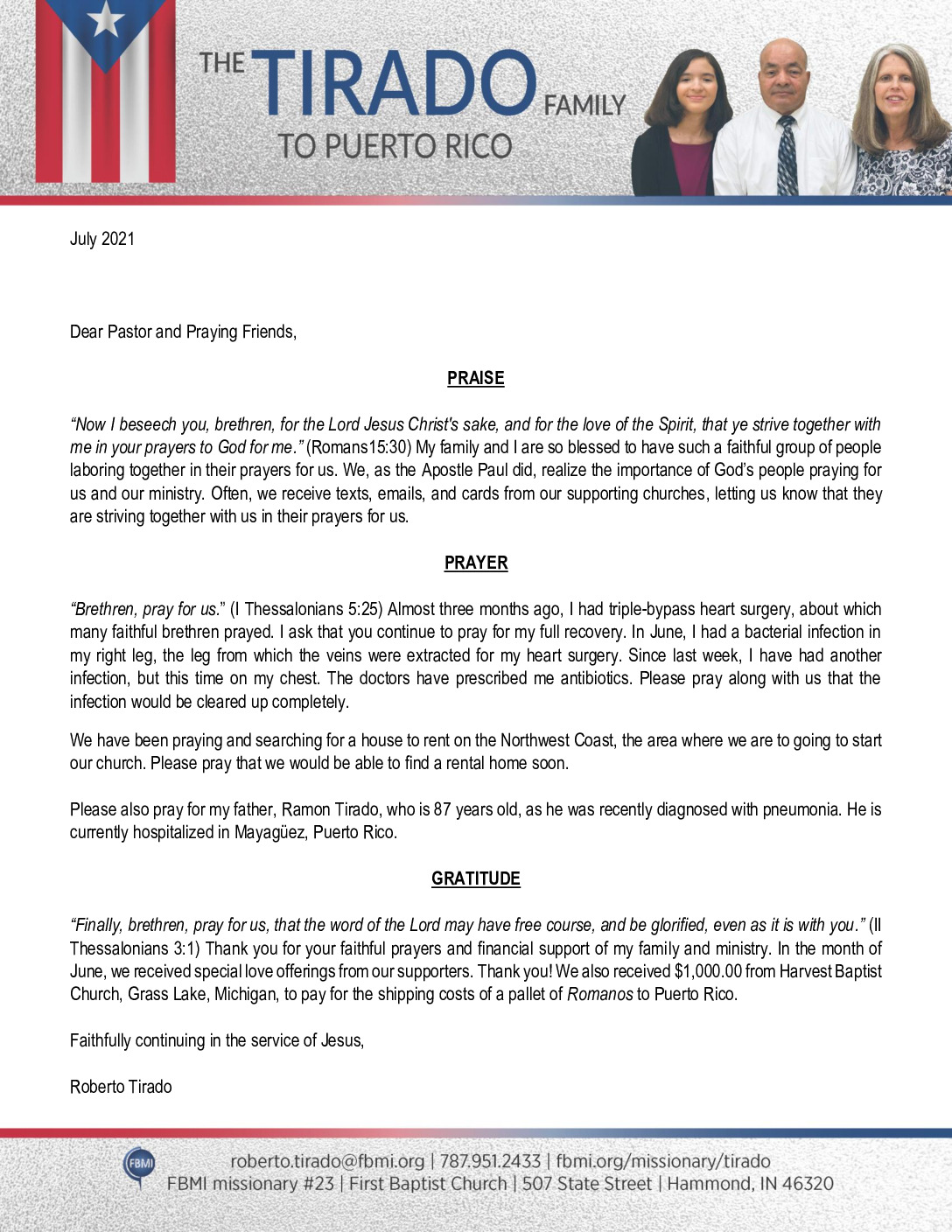 View Larger Image Roberto Tirado July 2021 Prayer Letter – 2 Proofreader2021-07-19T18:55:10-05:00July 19th, 2021| Share with others. FacebookXLinkedInEmail