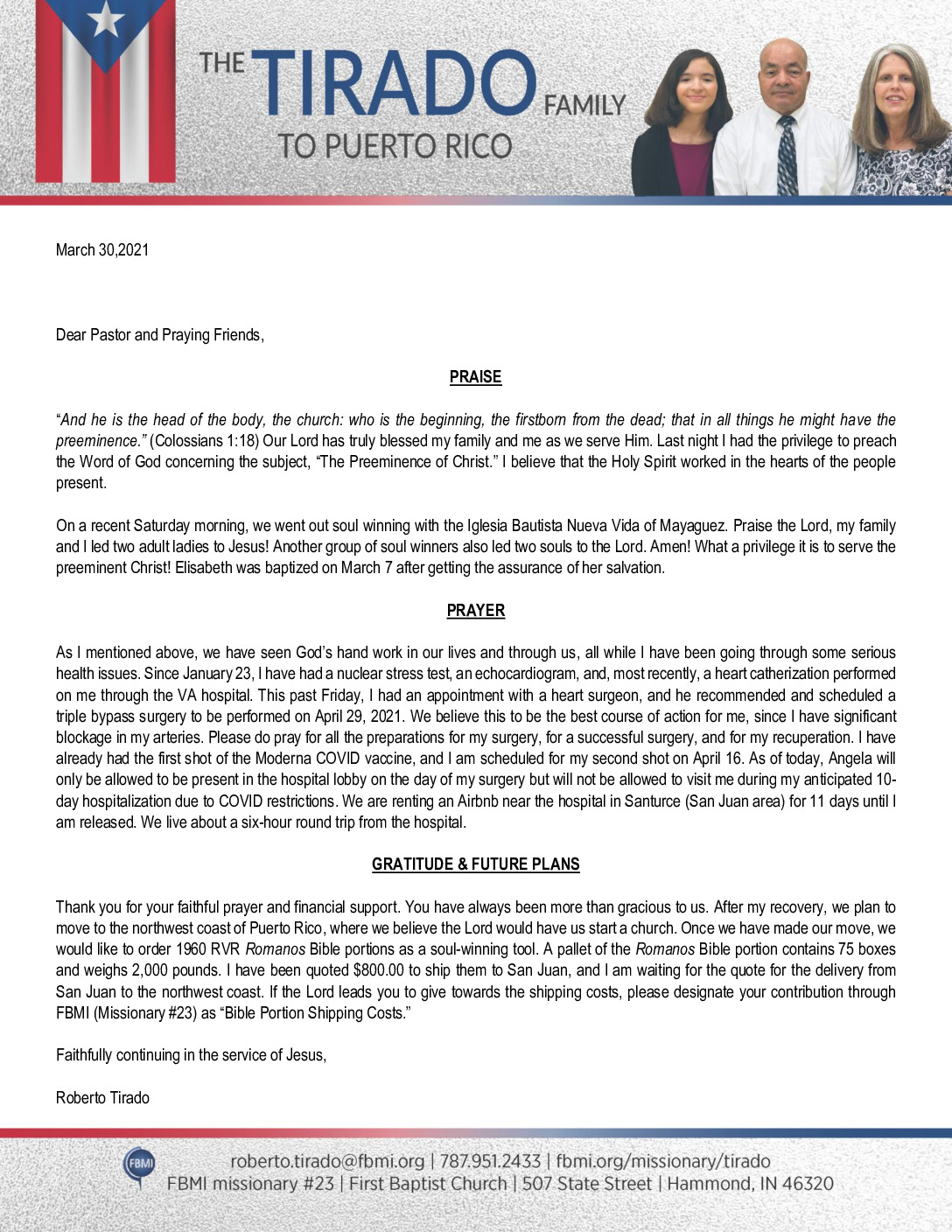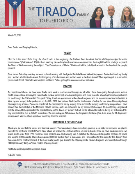 View Larger Image Roberto Tirado March 2021 Prayer Letter – Revised Proofreader2021-04-01T19:27:23-05:00April 1st, 2021| Share with others. FacebookXLinkedInEmail