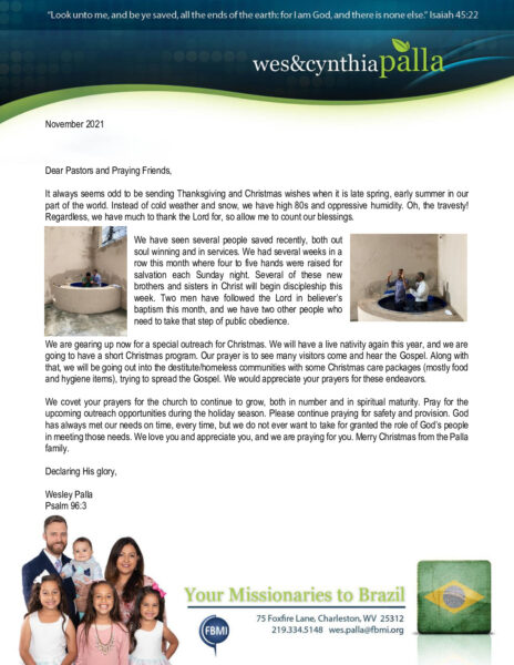 View Larger Image Wes Palla November 2021 Prayer Letter Proofreader2021-11-24T20:17:55-06:00November 24th, 2021| Share with others. FacebookXLinkedInEmail
