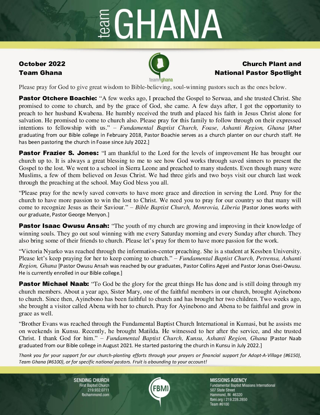View Larger Image Team Ghana October 2022 National Pastor Update Proofreader2022-10-26T17:39:45-05:00October 26th, 2022| Share with others. FacebookXLinkedInEmail