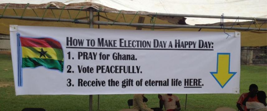 Ghana held its presidential elections on Wednesday, December 7. There were four polling stations on the property of the Fundamental Baptist Church International of Kumasi; all day, people were going and coming. The church set up a tent near the front entrance as a place for folks to hear the Gospel after they had voted. Soul winners handed out hundreds of tracts and presented the Gospel to over 50 Ghanaians. Thank God for peaceful elections and for souls saved.